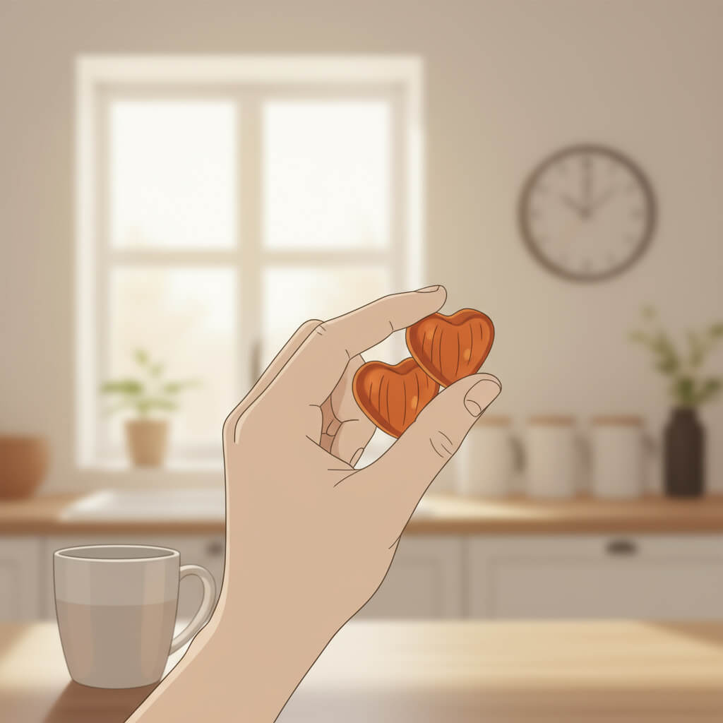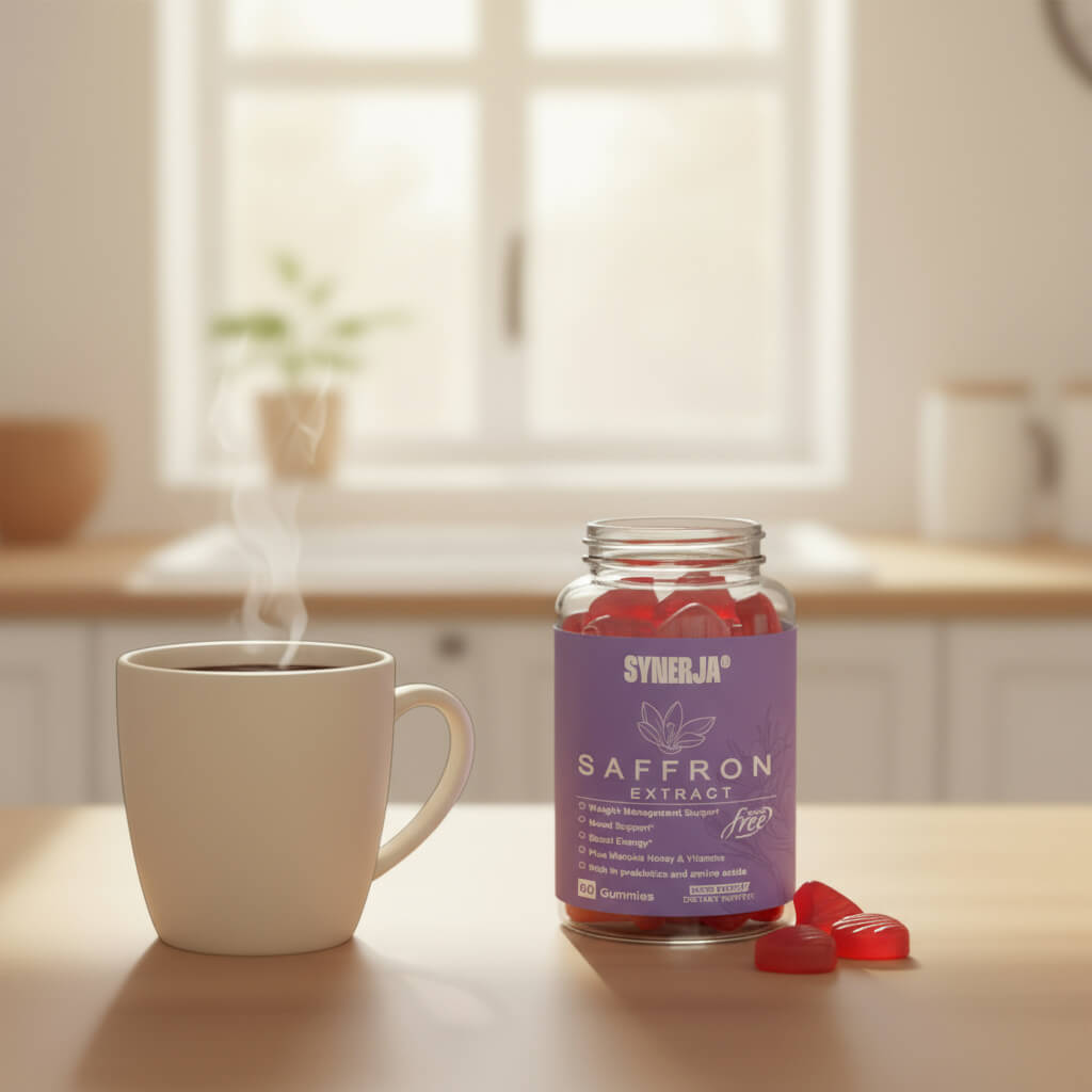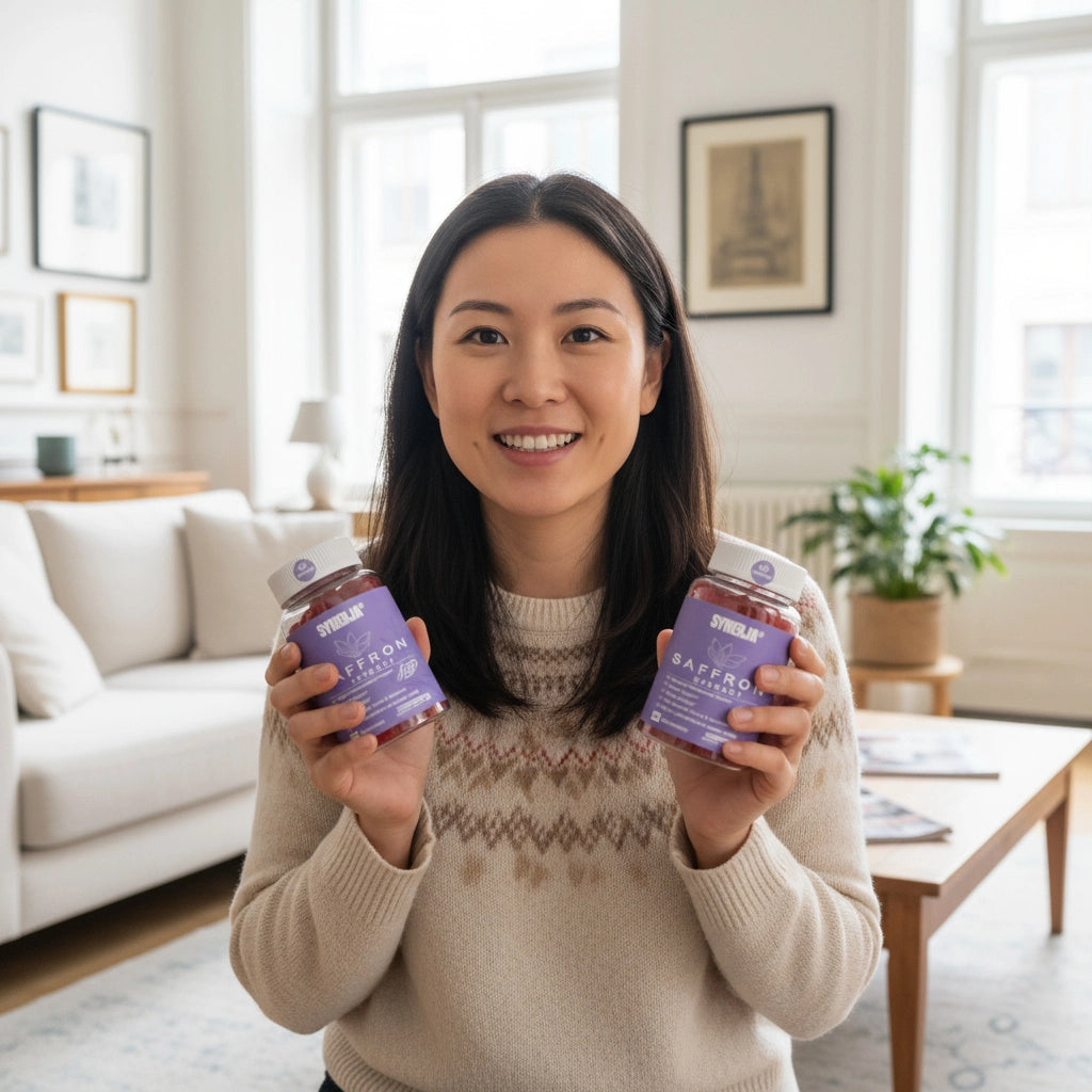 How it works: standardized saffron extract (0.3% safranal) + Vitamins C, D3, B6, B12 in a pectin-based, gelatin-free gummy. Take 2 daily at the same time.